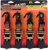Designed with the outdoor enthusiast in mind. Woodland Camo color webbing. Solid ratchet. Vinyl coated compact S-hooks. Size 1” x 8’. Rated capacity 1,200 lbs. Working load limit 400 lbs. Package of 4.